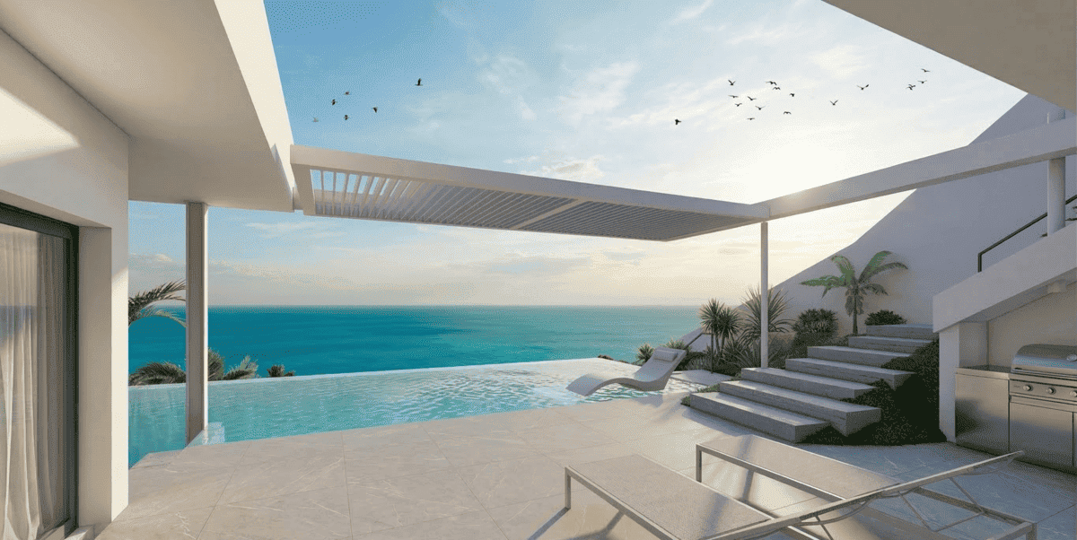 El punto culminante del diseño es la piscina infinita, que parece fusionarse con el horizonte, creando la ilusión de que se extiende hacia el mar. Este recurso no solo maximiza el impacto visual, sino que también realza la sensación de tranquilidad y exclusividad del lugar.