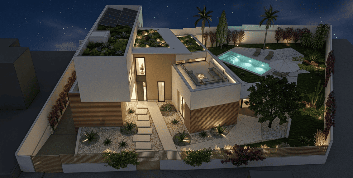 Y cuando cae la noche, aparece otra capa: la iluminación escenográfica exterior. No para “iluminarlo todo”, sino para destacar lo que merece ser mirado: la vegetación, los rincones, los planos que dan profundidad. Una luz que guía, que acompaña y que hace que el jardín siga siendo parte de la casa, incluso cuando ya no hay sol.