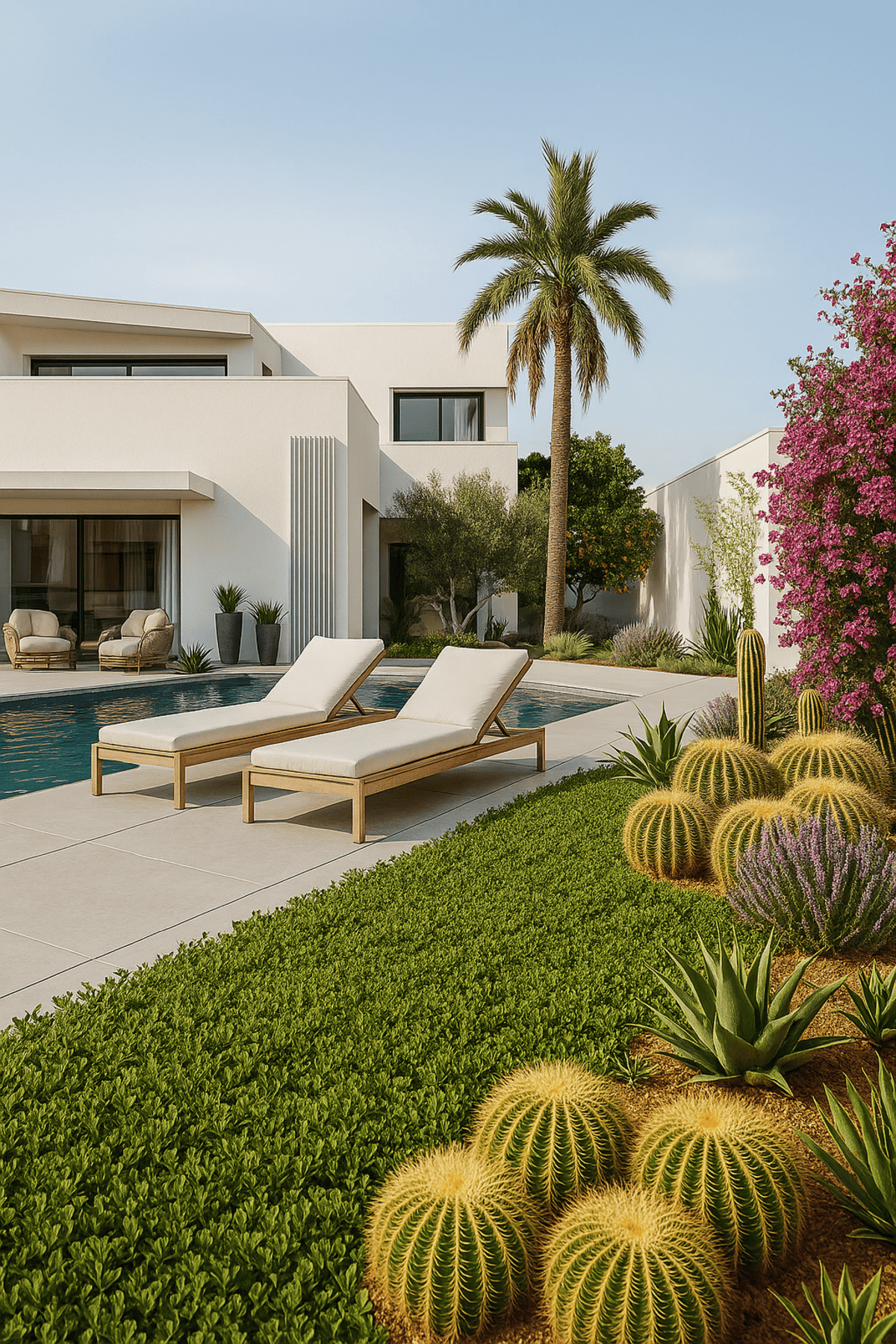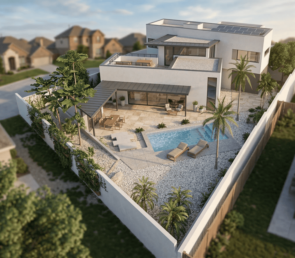Pero Casa Enlazada no se entiende sin su exterior. Aquí el paisajismo no es “lo último que se hace”. Es parte del proyecto desde el inicio. Se ha trabajado un jardín mediterráneo de bajo mantenimiento, con distintos ambientes según el uso y las relaciones de la vivienda con el terreno. Se plantean desniveles mínimos para que la parcela se recorra con naturalidad, descubriendo diferentes puntos de vista y diferentes rincones.